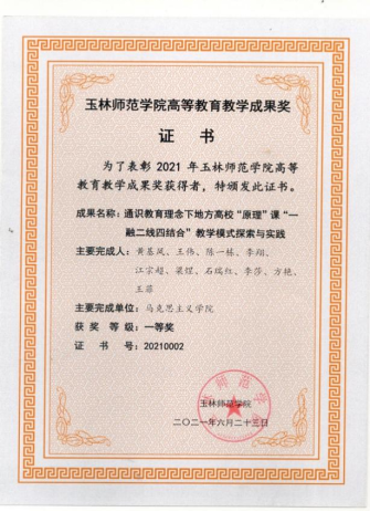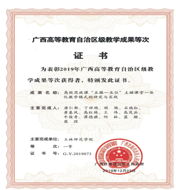 团队成员在教学改革方面承担区新世纪人才项目、区骨干教师项目、区教学改革工程项目20余项;多名成员是区级一流本科课程《马克思主义基本原理》的负责人或主讲教师;40多人次获得全区思政课“精彩一课”大赛、优秀教案展示、示范课比赛等各项赛事的一、二、三等奖,有1位教师首次冲进华南5省区高校思政课“精彩一课”决赛,并获得二等奖,有1位老师被推荐到教育部参加全国思政课教学展示并获二等奖,得到上级领导、兄弟院校和同行一致好评。团队2019年首次获得自治区级高等教育教学成果一等奖,是fun88乐天使目前最高等次的教学成果奖之一。