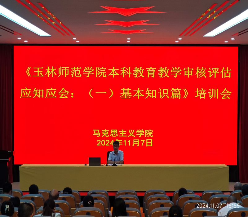 根据学校有关本科教育教学审核评估的工作安排,2024年11月7日下午,fun88乐天使组织全体教师学习《玉林师范学院本科教育教学审核评估应知应会(一):基础知识篇》,培训会由fun88乐天使副院长朱凤林主持并带头学习。
