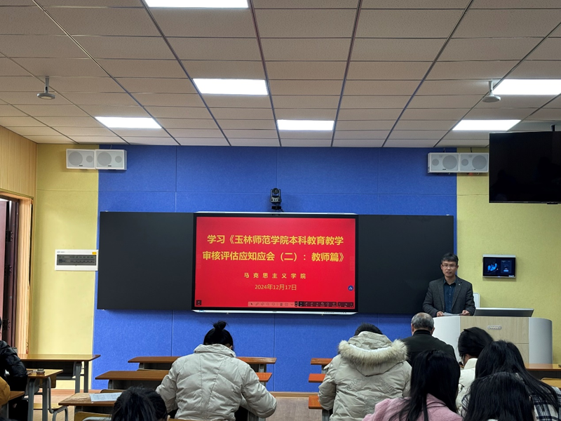 为更好迎接本科教育教学审核评估,根据学校关于本科教育教学审核评估工作安排,2024年12月17日下午,fun88乐天使组织全体教师共同学习《玉林师范学院本科教育教学审核评估应知应会(二):教师篇》,会议由fun88乐天使副院长朱凤林主持并带头学习。
