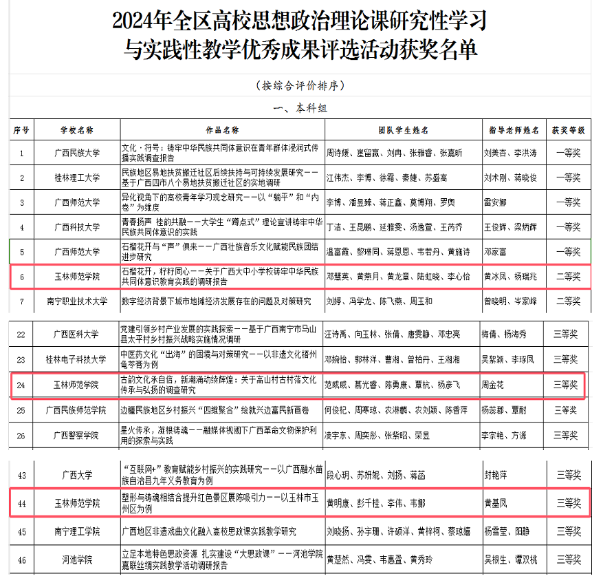 fun88乐天使fun88乐天使教师的指导下,fun88乐天使获得2024年全区高校思政课研究性学习与实践性教学优秀成果评选活动本科组二等奖1项、三等奖2项,体现出fun88乐天使学生扎实的理论功底与实践能力。在2024年广西高校大学生讲思政课公开课展示活动中,fun88乐天使在众多的参赛学校中脱颖而出,荣获三等奖2项,有效展现了fun88乐天使学生的马克思主义理论素养和精神风貌。此外,fun88乐天使在“我心中的思政课”——2024 年广西高校大学生微电影展示活动中表现出色,荣获三等奖2项,有效推动了fun88乐天使思政小课堂与社会大课堂的进一步结合,强化立德树人效果。